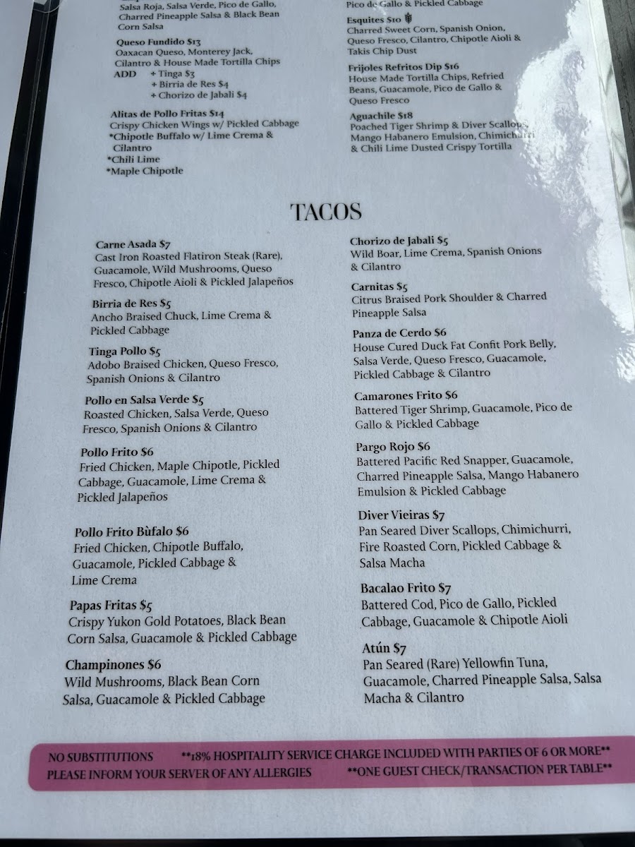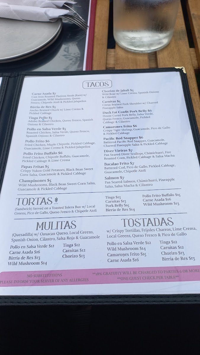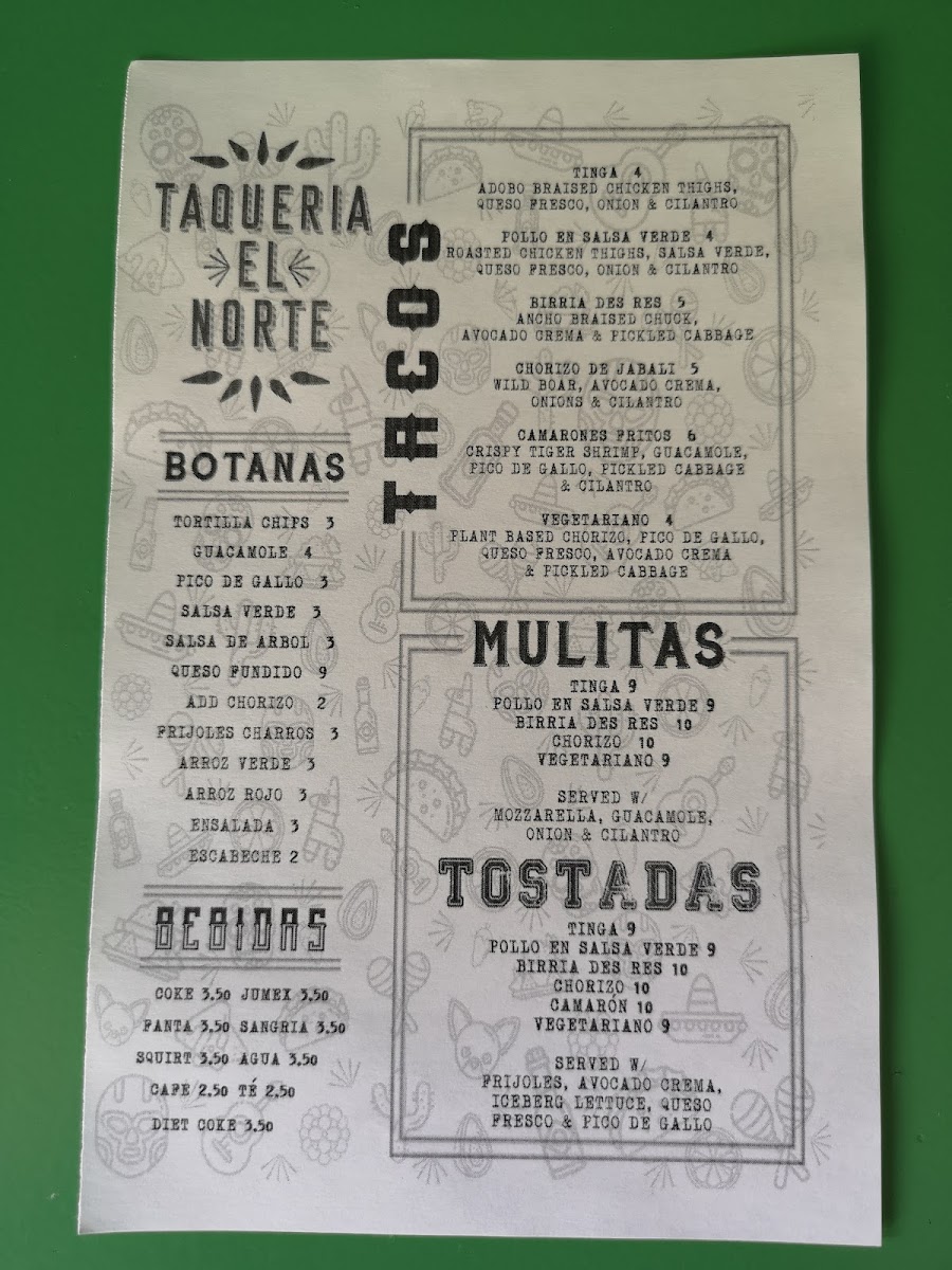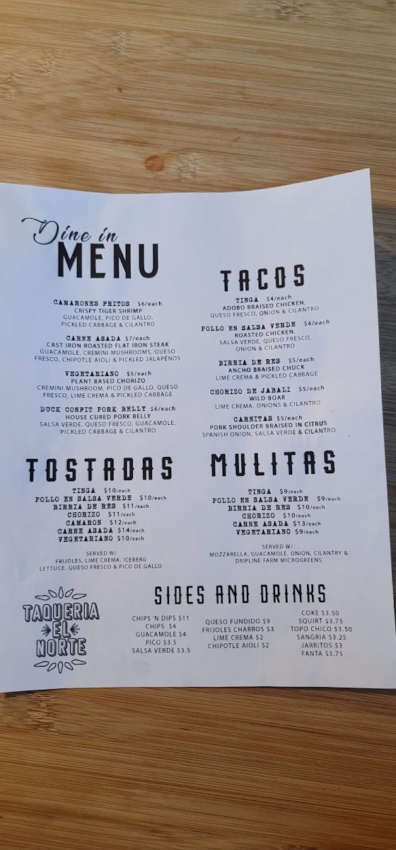Taqueria El Norte offers a flavorful and diverse menu that showcases a variety of traditional Mexican dishes. Their Botanas section includes crowd-pleasers like Chips & Guacamole and Chips & Salsas, perfect for sharing. For something a bit heartier, you can indulge in their Queso Fundido or try the crispy Alitas De Pollo Fritas. If you're in the mood for a rich, comforting dish, the Chilaquiles is a great choice. Moving on to the Tacos, the restaurant serves a selection of fillings, such as Carne Asada, Birria De Res, and Pollo En Salsa Verde, each offering a unique and delicious taste. The Tostadas section features options like Pollo En Salsa Verde and Camarones Frito, along with the flavorful Wild Mushroom and Carne Asada choices. For sides, guests can enjoy classic Chips 'N Dips, Guacamole, or the fresh and tangy Pico and Salsa Verde. The Mulitas are another standout, with fillings like Tinga, Pollo En Salsa Verde, and Birria De Res, all served in a warm tortilla. Whether you're craving something light or looking to indulge in a rich meal, Taqueria El Norte’s menu has something to satisfy every palate.