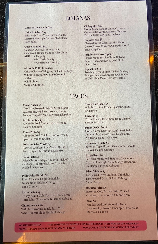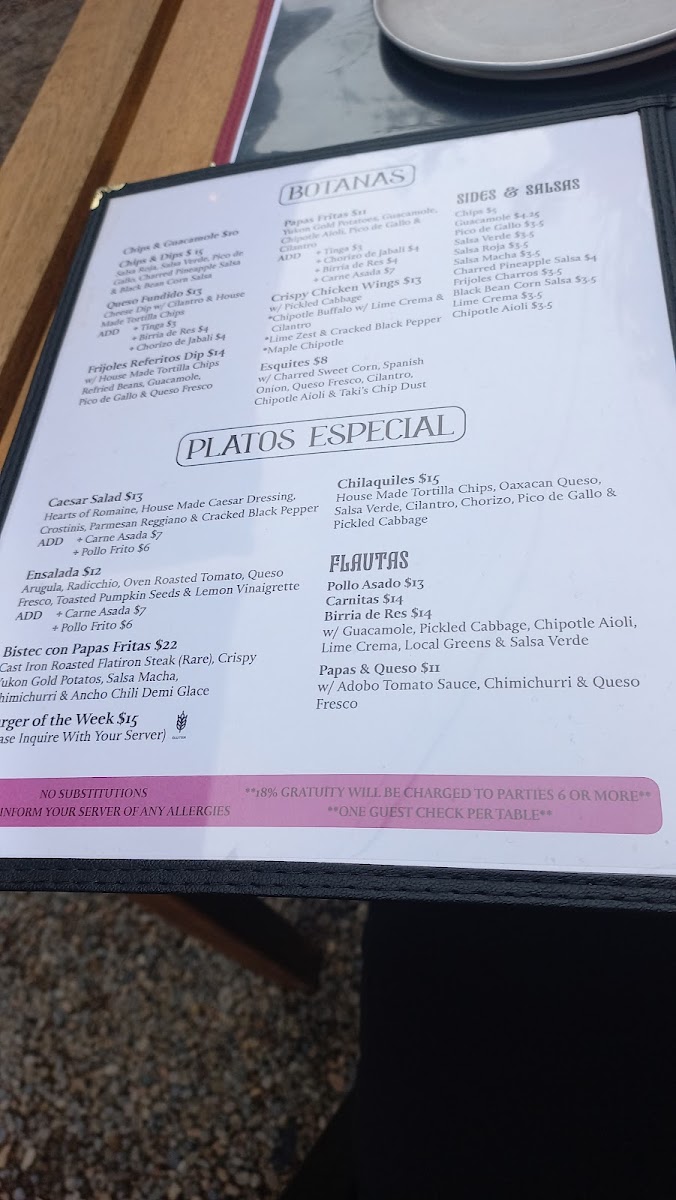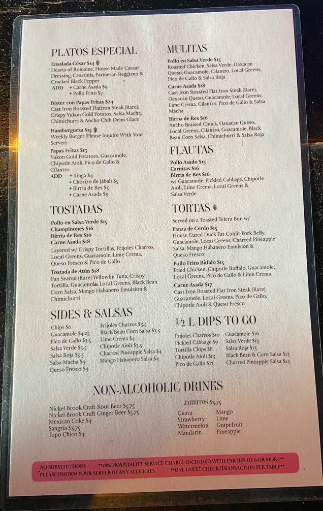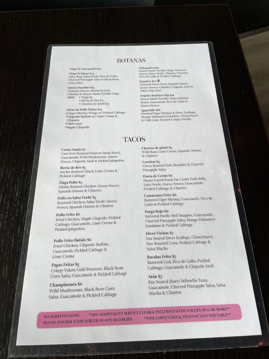 Taqueria El Norte offers a flavorful and diverse menu that showcases a variety of traditional Mexican dishes. Their Botanas section includes crowd-pleasers like Chips & Guacamole and Chips & Salsas, perfect for sharing. For something a bit heartier, you can indulge in their Queso Fundido or try the crispy Alitas De Pollo Fritas. If you're in the mood for a rich, comforting dish, the Chilaquiles is a great choice. Moving on to the Tacos, the restaurant serves a selection of fillings, such as Carne Asada, Birria De Res, and Pollo En Salsa Verde, each offering a unique and delicious taste. The Tostadas section features options like Pollo En Salsa Verde and Camarones Frito, along with the flavorful Wild Mushroom and Carne Asada choices. For sides, guests can enjoy classic Chips 'N Dips, Guacamole, or the fresh and tangy Pico and Salsa Verde. The Mulitas are another standout, with fillings like Tinga, Pollo En Salsa Verde, and Birria De Res, all served in a warm tortilla. Whether you're craving something light or looking to indulge in a rich meal, Taqueria El Norte’s menu has something to satisfy every palate.